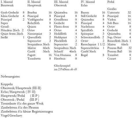 Dieses Orgelwerk ist, besage der daran stehenden Jahreszahl, 1601. und wiederum 1670. renoviert und mit einer neuen Baß-Stimmen und Brustwerk vermehret worden. Daß also heute zu Tage diese Orgel nachgesetzte 35 Stimmen hält. Hat 3 Manual Clavier und 1 Pedal und noch zur Zeit 10 Blaßbälgen.