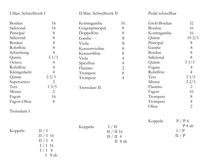 Das zwei manualige Werk mit Schwellwerk I, Schwellwerk II und integrierten Pedal hat ihren Platz auf der vorhandenen Empore im Westen gegenüber dem Altar. Die beiden Schwellwerke sind selbständige Teilwerke, jedes für sich ein selbständiges Klangmodul mit eigenem Gehäuse, Technik und eigener Windanlage. Sie können auch im Kirchenraum aufgestellt und verschoben werden, verstehen sich, klanglich einander zugeordnet, als ein Werk mit unterschiedlichen Charakteren und erreichen einen differenzierten Gesamtklang.